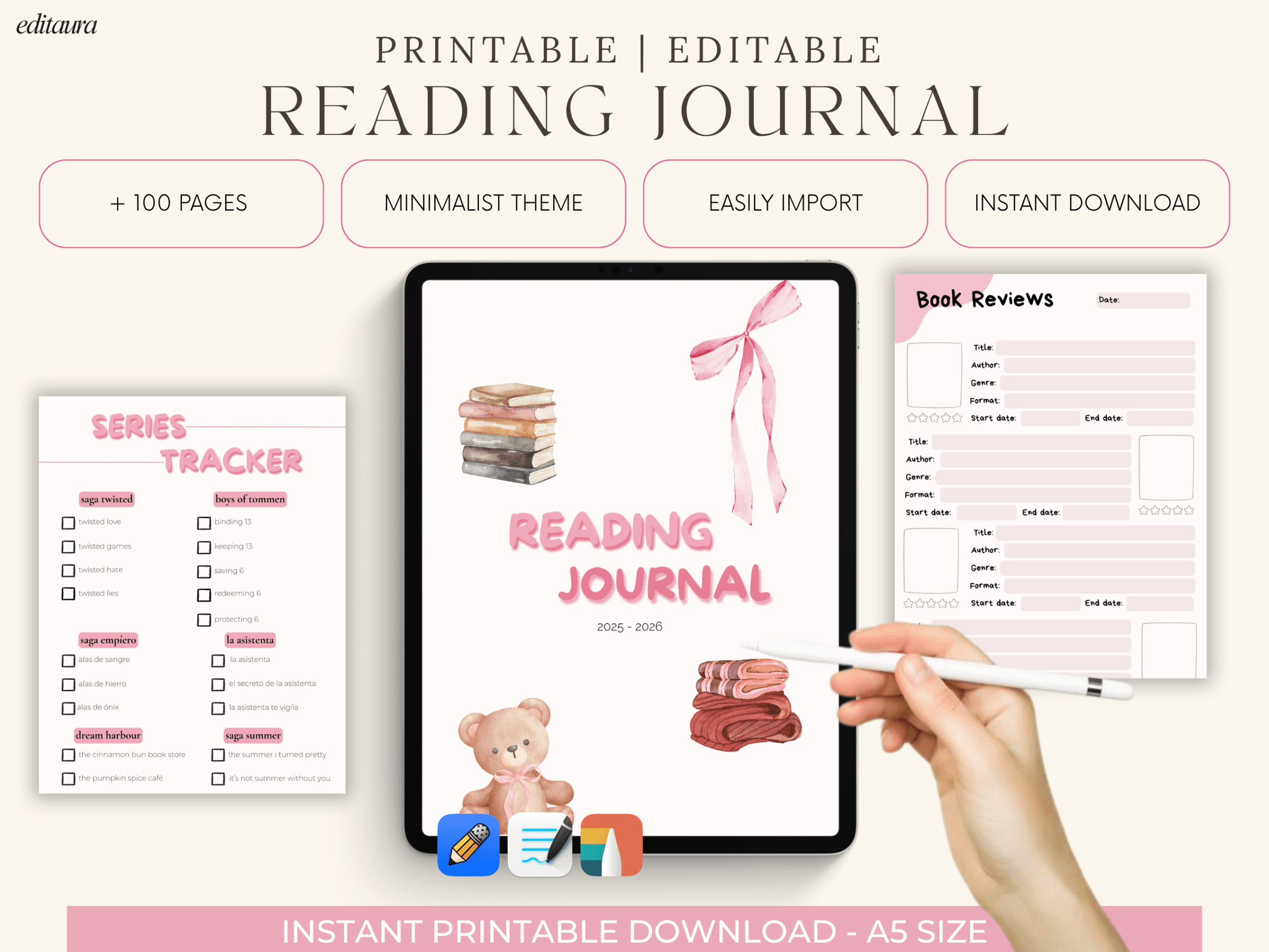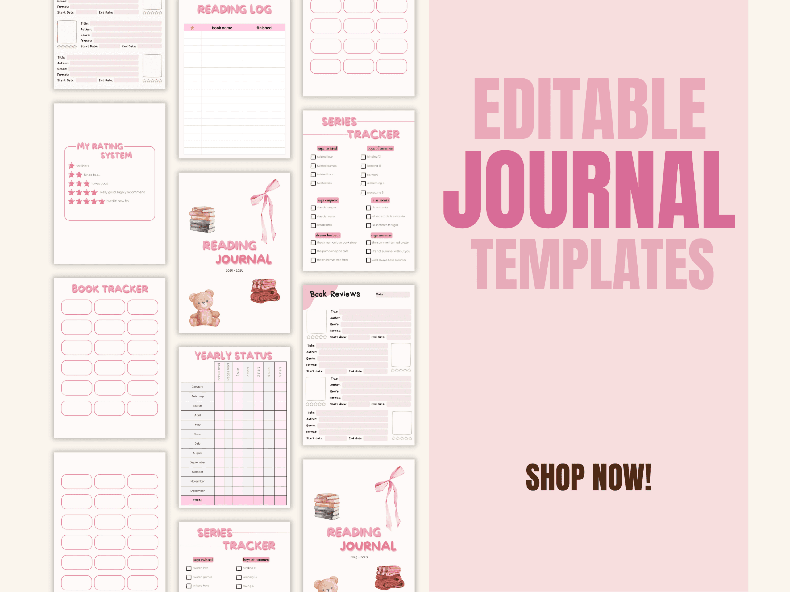 With a soft, aesthetic design and easy-to-use layouts, you can track your books, reviews, series progress, and yearly reading goals all in one place.